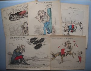 [Caricatures] Napoléon III et la chute du Second Empire. 1870-1871. Réunion de + de 130 lithographies coloriées et documents anti-bonapartistes parus dans divers journaux satiriques de l'époque, principalement dans les années 1870-1871. Dessins...