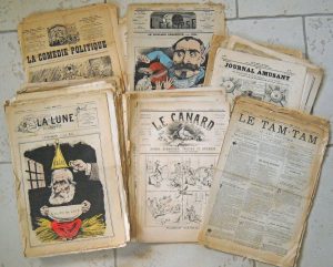 1871-1880 - La Lune Rousse, 44 ex., 1867-1879 - La comédie politique, 32 ex., 1882-1883 - Le Tam-Tam, 4 ex., 1878-1879 - Le Monde pour rire, 3 ex., 1868-1870 - La Timbale, 2 ex., 1873 - Le Monde plaisant, 2 ex., 1878 - Le Pilori, 3 ex., 1886, 1891 et 1898 - Le Journal Amusant ; La Charge ; Cri-Cri ; La Fronde ; La Comète ; L'Indépendance parisienne ; Le Carillon ; Le Sifflet ; L'Eclipse. En l'état.