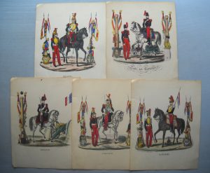 17 cm ; et 5 lithographies à rehauts de couleurs par Mondor de l'Aigle éditées par Fournier à Paris, 25,5 x 20 cm. Représentation de militaires en uniforme sous le Premier et le Second Empire.