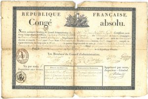 prix des ouvrages dépendans du service du génie dans la place de Lyon, pendant les années 1825, 1826 et 1827 ", 14 pages impr. in-fol. - Passeport à l'étranger délivré par le sous-préfet de Briey en Moselle, 8 juillet 1863, cachet de la sous-préfecture. - Congé de service délivré à un sergent du 11e régiment d'infanterie de ligne, Amiens, 31 décembre 1826, 26 x 41 cm. - Congé absolu délivré à un sergent de la 91e demi brigade de ligne, Monza, 22 germinal an X (12 avril 1802), signatures des officiers et sous-officiers, cachets encre de la demi brigade et de l'inspecteur aux revues, en l'état