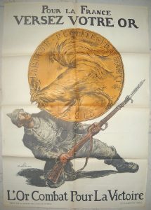 c'est accroitre notre puissance militaire, c'est protéger nos soldats, c'est abréger la guerre en hâtant la victoire... C'est l'union qui fait la Force. C'est le dévouement de tous à la cause de la France qui nous donnera la Paix par la Victoire." [1915], Lib. Impr. réunies 7 rue St Benoit, Martinet Directeur, 111 x 90 cm, traces de plis, T.B.E. - 6 affiches : " Pour la France, versez votre or. L'or combat pour la victoire. " [1915] par Abel Faivre, Imp. Devambez Paris, 114 x 79 cm, traces de plis, T.B.E. Cette affiche de la Première Guerre mondiale, publiée à Paris en 1915, exhorte les citoyens français à verser leurs pièces d'or " pour la France " à l'aide du slogan " l'or combat pour la victoire ". Le gouvernement français avait besoin d'or pour acheter le matériel militaire nécessaire en temps de guerre auprès des États-Unis et d'autres pays, d'où l'appel aux citoyens pour transformer leurs pièces d'or en dépôts bancaires. Au centre de l'affiche, une pièce d'or, portant l'emblème symbolique du coq gaulois en relief, écrase un soldat allemand pour illustrer cette idée. L'affiche est d'Abel Faivre (1867-1945), célèbre illustrateur et caricaturiste qui produisit un grand nombre d'illustrations pour des publications telles que Le Figaro, Le Journal, L'Écho de Paris et Le Canard sauvage, durant sa longue carrière de 1895 à 1942. Faivre créa de nombreuses affiches pour soutenir l'effort de guerre français. Cette affiche fut publiée par Devambez, maison de graveurs et d'imprimeurs reprise par Édouard Devambez en 1873, puis par son fils André Devambez. Spécialisée dans l'impression de qualité d'œuvres d'art, la maison produisit également de nombreuses affiches populaires pendant la guerre.