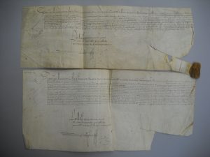 vélin obl. in-4 dont l'une avec reste de sceau de cire jaune, et l'autre petits manques. Commission aux sieurs d'O et de Beauvais commandeurs de l'ordre du Saint Esprit, l'assemblée dudit ordre, ayant choisi Robert de la Vieuville pour entrer audit chapitre quand il y aura des places du nombre des 100 fixées par les statuts, pour enquêter sur sa noblesse, savoir s'il est gentilhomme de nom et d'armes de trois générations paternelles, si le surnom et armes qu'il porte l'ont été par ses prédécesseurs, de quelles seigneuries ils ont joui, etc ; commission à l'archevêque de Reims, commandeur, pour informer de la religion catholique, apostolique et romaine, les bonnes vies et mœurs de Robert de la Vieuville. - 3 pièces relatives à l'enquête de bonnes mœurs, 1595. - Quittance de 12 aunes de velours noir reçu de Robert de la Vieuville par le maître des cérémonies et prévôt de l'ordre du Saint Esprit, 4 janvier 1599. - P.S., Paris, 26 octobre 1614, signée par Brûlart, secrétaire d'état et grand trésorier des Ordres du roi, papier in-fol. Réception entre les mains dudit Brûlart du collier de l'ordre du Saint Esprit que portait le défunt Robert de la Vieuville. - P.S., Paris, 28 novembre 1619, signée " Louis " [Louis XIII roi de France (1601-1643)] et contresignée par le secrétaire d'état [Louis] Potier [de Gesvres], vélin obl. Commission au cardinal de la Rochefoucauld pour enquêter sur les bonnes vie et mœurs de Charles de la Vieuville, choisi par le roi pour recevoir l'Ordre du Saint Esprit. - Certificat et 2 quittances de paiement délivrées au marquis de la Vieuville pour sa promotion de chevalier dans l'ordre du Saint Esprit, lors de la cérémonie qui s'est tenue en l'église des Augustins à Paris le 31 décembre 1619.