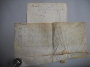 Brevet délivré à Charles de la Vieuville de maréchal de camp et armées du roi. - P.S., Paris, 11 février 1623, signée " Louis " [Louis XIII roi de France (1601-1643)] et contresignée par le secrétaire d'état de Loménie, vélin obl. in-plano. Lettres patentes du roi accordant la charge de surintendance des finances à Charles de la Vieuville, en remplacement du comte de Schomberg. - 2 pièces papier, 1632, relatives à la séparation de biens demandée par Marie Bouhier de Beaumarchais, épouse du marquis de la Vieuville, " voyant l'état de la perte et destruction de la fortune " de son mari exilé. - P.S., septembre 1638, signée " Carolus Rex " [Charles Ier, roi d'Angleterre (1600-1649)], cachet sec aux armes d'Angleterre, vélin. Lettres de sauvegarde en blanc pour circuler librement dans les pays au-delà de la mer. - 2 P.S., octobre 1641, sur vélin, commission délivrée par les états généraux des Provinces Unies des Pays-Bas et par Frédéric-Henri d'Orange-Nassau en faveur du marquis de la Vieuville lui donnant le commandement d'une compagnie de cavalerie de leurs troupes, vacante par la démission du duc de Bouillon. Charles Ier de la Vieuville (1582-1653), fils de Robert et de Catherine d'O, est le plus célèbre de la famille, celui qui s'éleva le plus haut, posa sur son front la couronne ducale, fut premier ministre et coopta produisit Richelieu. D'abord marquis, puis duc de la Vieuville, pair de France et grand fauconnier en 1612 en remplacement de son père. En 1616, il est capitaine de la première compagnie des gardes du corps du roi, lieutenant général en Champagne et Rethélois ; en 1619, chevalier de l'Ordre du Saint Esprit ; en 1622, maréchal de camp sous les ordres du duc d'Angoulême, au siège de Montpellier. Puis il quitte les armes pour rejoindre l'administration royale et remplace le 21 janvier 1623, Henri de Schomberg comme surintendant des finances, fait entrer Richelieu au ministère, lequel le fait ensuite congédier et arrêter en 1624. Il rentre en faveur en 1643, redevient surintendant des finances en 1651, est fait duc et pair la même année et meurt en 1653. Il épousa en 1611 Marie Bouhier, fille de Vincent Bouhier, seigneur de Beaumarchais, conseiller d'état et trésorier de l'Epargne, l'un des plus importants financiers du royaume. Au commencement de l'année 1623, de la Vieuville, poussé par son beau-père, parut de plus en plus ambitieux et fit partie de ceux qui fomentèrent des intrigues dans le but de faire de Schomberg, surintendant des finances. Louis XIII se laissa prendre aux belles promesses de la réorganisation de l'état des finances de l'état présentée par Bouhier de Beaumarchais et son gendre. Il renvoya Schomberg et donna la surintendance à la Vieuville le 21 janvier 1623. Très vite, de la Vieuville, voulant revoir les pensions versées aux grands du royaume, soulève une cabale contre lui et son beau-père. Dans le même temps, il réussit à faire entrer Richelieu au Conseil privé en avril 1624 contre l'avis de Marie de Médicis. Dès lors, Richelieu profita de la période de déclin du marquis de la Vieuville pour manœuvrer et récupérer la fonction tant convoitée de surintendance des finances. Sous l'influence de Richelieu, Louis XIII le révoqua et le fit emprisonner avec son beau-père le 13 août 1624 au château d'Amboise. Accusé de prévarication et condamné il est disgracié et le roi se contenta de le laisser en exil sans vouloir faire appliquer le jugement. En septembre 1625, le marquis et son beau-père s'évadent et passent à l'étranger. Réfugié en Angleterre, il tenta de proclamer son innocence contre les accusations portées à son encontre. Le 1er juin 1626 Louis XIII reçut en audience particulière l'épouse de l'ancien surintendant et lui accorda la liberté de son mari et la permission de rentrer en France. Dès son retour le marquis de la Vieuville fut de toutes les conspirations contre Richelieu, ayant rejoint le parti de Gaston d'Orléans. En 1631, Marie de Médicis et le frère du roi son exilés aux Pays-Bas, rejoints par leurs partisans dont de la Vieuville. La plupart furent jugés par une chambre de justice pour lèse-majesté. Décrété d'accusation pour complot contre l'Etat, la chambre de l'Arsenal condamna à mort Charles de la Vieuville par arrêt du 6 janvier 1632 avec confiscation de ses biens. Il fut également dégradé de l'ordre du Saint Esprit. La même année, l'épouse du marquis obtint la séparation de biens afin de pouvoir sauvegarder le patrimoine familial. Exilé pendant plus de 18 ans, pour une grande partie aux Pays-Bas, où il put obtenir pour son fils aîné un emploi dans l'armée. La Hollande était à cette époque le lieu de choix pour les jeunes nobles qui voulaient s'initier au métier militaire sous la direction des princes d'Orange.