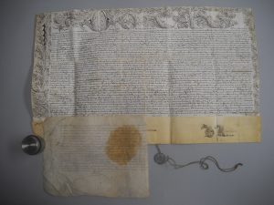 Lot de + de 55 pièces, parchemin et papier, dont plusieurs vélins écrits en latin à l'encre brune, lettrines, signatures et diverses bulles papales de plomb pendantes sur cordelette de chanvre jaune et rose d'Urbain VIII (pape de 1623 à 1644), d'Innocent X (pape de 1644 à 1655), d'Alexandre VII (pape de 1655 à 1667), et d'Innocent XI (pape de 1676 à 1689), concernant les provisions de bénéfices et prises de possession des prieurés de Grand-Beaulieu les Chartres et de Sainte Trinité de Combourg, des abbayes de Savigny (près d'Avranches), de Saint Martial de Limoges et de Saint Laumer de Blois. Dont 1 pièce encadrée. - P.S., château de Blois, 14 décembre 1643, signée " Gaston " [Gaston de France, dit d'Orléans (1608-1660)], vélin. Résignation du prieuré de Grand Beaulieu par Charles de la Vieuville à Henri de la Vieuville son frère. - Acte de réception dans l'ordre des hospitaliers de Saint Jean de Jérusalem d'Henri de la Vieuville, 1631, papier, bulle de plomb du grand maître Antoine de Paule. - P.S., Poitiers, 2 novembre 1651, signée " Louis " [Louis XIV roi de France (1638-1715)] et contresignée par le secrétaire d'état de Loménie, vélin obl. Brevet de conseiller d'état délivré au chevalier de la Vieuville. - P.S., Paris, 20 septembre 1651, signée " Louis " [Louis XIV roi de France (1638-1715)], vélin obl., reste du grand sceau de cire jaune aux armes de France. Lettres patentes du roi accordant 4000 livres de pension au chevalier de la Vieuville. - P.S., Sully-sur-Loire, 1er avril 1652, signée " Louis " [Louis XIV roi de France (1638-1715)], vélin obl. Lettres patentes du roi ordonnant l'abbé de la Vieuville conseiller au conseil d'état privé et des finances du roi. - P.S., Sedan, 4 juillet 1654, signée " Louis " [Louis XIV roi de France (1638-1715)], vélin obl. Lettres patentes du roi ordonnant l'abbé de la Vieuville conseiller ordinaire au conseil d'état privé et des finances du roi. - P.S., Paris, 1er novembre 1652, signée " Louis " [Louis XIV roi de France (1638-1715)], vélin obl. Donation par le roi de l'abbaye et collégiale de Saint Martial de Limoges. - P.S., château de Blois, signée " Gaston " [Gaston de France, dit d'Orléans (1608-1660)], vélin obl. Accord par Gaston d'Orléans de la suppression et extinction du titre du prieuré de Grand Beaulieu les Chartres pour y être érigé un séminaire et résignation de la pension de 2000 livres auu profit de l'abbaye de Saint Laumer de Blois. - P.S., château de Blois, 12 mars 1659, signée " Gaston " [Gaston de France, dit d'Orléans (1608-1660)], vélin. Confirmation de la nomination de Charles François de la Vieuville abbé commendataire de l'abbaye de Saint Laumer de Blois. - P.S., Saint Germain en Laye, 3 février 1676, signée " Louis " [Louis XIV roi de France (1638-1715)], vélin. Don de l'abbaye commendataire de Savigny de l'Ordre de Citeaux à François Marie de la Vieuville, fils de Charles II. Henri de la Vieuville, chevalier de Malte, abbé de Savigny sur la démission de son frère, puis prieur commendataire du prieuré séculier du Grand-Beaulieu les Chartres, colonel d'un régiment de cavalerie, puis maréchal de camp des armées du roi, conseiller d'état es conseils privé et des finances par lettres du 2 novembre 1651. Il mourut le 12 juin 1652 des blessures qu'il avait reçues au siège d'Étampes pour le service du roi. Charles-François de la Vieuville, prieur du Grand-Beaulieu les Chartres, abbé de Savigny en 1665, de Saint Martial de Limoges et de Saint Laumer de Blois, conseiller d'état ordinaire, sacré évêque de Rennes le 4 avril 1660, décédé en janvier 1675. Jean-Evangeliste fils de Charles II, bailli et grand-croix de l'ordre de Saint Jean de Jérusalem, commandeur des commanderies du Temple ; de la Rochelle et d'Estrépigny, ambassadeur de Malte auprès du roi, décédé en octobre 1714.