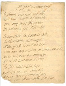 séparée de son mari, elle mena une vie galante et vagabonde, et fut l'amie de Saint-Évremond. Lettre autographe à sa sœur la duchesse de Bouillon ; 2 pages et demie in-4, adresse avec cachet cire rouge (camée au dromadaire), déchirures et réparations. Pour sa sœur Marie-Anne, duchesse de Bouillon (1646-1714), qui fut l'amie et la protectrice de La Fontaine, elle recopie une piquante épitre en vers (14 vers) que lui a adressée Saint-Évremond : " La Beauté vous rend adorable […] Vous aves des enfans fait par le Mazarin / Pas un qui ne soit son ouvrage / Qui ne soit seurement de luy "…, suivie de sa propre réponse en 10 vers : " Enfant de lui, cet un grand mal / Mais pour en consoler la mere / Et cet un bonheur sans esgal / Aucun d'eux ne resemble au père "… Elle ajoute ce commentaire : " Je treuve que le vieliart a asses de raison mais cela ne rendra pas ma condition melieure ". Elle est heureuse de savoir sa sœur à Saint-Cloud où elle doit se divertir. Puis elle fait allusion à sa déplorable passion du jeu et à sa solitude : " je suis si malheureuse que je nay pas le bonheur de perdre. Tous les sou sont bani de la maison ; tout le monde est mort, malade ou en campagne ou marié "…
