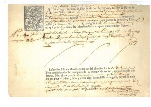 [XVIIIe siècle - Marine] 3 pièces maritimes signées. Connaissement maritime, fait à Carthagène le 27 juillet 1747, de marchandises de laines transportées sur une tartane appelée Jésus Marie Ste Anna, allant du port du Havre à celui de...