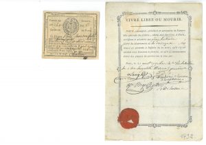 Lettre imprimée du président de la section de l'Hôtel de Ville, 26 sept. 1791 - Certificat de résidence délivré et signé par les officiers de la section des Tuileries, 5 nov. 1791, vignette révolutionnaire - L.S. par Nicolas CHAMBON de MONTAUX (maire de Paris du 30 nov. 1792 à fév. 1793), 31 mars 1792, vignette - Congé absolu délivré à un fusilier de la garde nationale parisienne, bataillon des ports, quais et isles de Paris, 30 juin 1792, signatures, vignette et encadrement impr. - Certificat de serment de fidélité la République délivré par la section du Marais, 3 sept. 1792, en partie impr. - Reçu d'un dépôt d'armes délivré par la section d'Henri IV (devenu par la suite du Pont Neuf), 3 sept. 1792, cachet de cire rouge - Certificat délivré par les officiers civils et militaires de la section du Fauxbourg Montmartre, 14 sept. 1792, en-tête imprimé - Passeport délivré par le ministère de la guerre, cachet cire rouge, et cachet rond de la section des Champs Elysées, février 1794 - Procès-verbal du vote des officiers de la compagnie révolutionnaire de la section de la République, 26 mars 1794, cachet encre rouge de la section - Nomination délivrée par la section de l'Homme Armé, 27 mars 1794, cachet encre de la section - Ordre de mobilisation de la section Guillaume Tell, 3 avril 1794, en-tête - Certificat de service délivré à un fusilier de la 2e Cie de la force armée de la section de Bonne Nouvelle, 15 signatures, 2 juin 1794, cachet encre du comité militaire de la section - Certificat délivré par les membres du comité de surveillance de la section Poissonnière, 11 juin 1794, cachet encre de la section - L.A.S. de FARIAU, président de la section de Marat et Marseille, 4 juillet 1794, cachet encre rouge de la section - Certificat signé par les membres de la section de l'Observatoire, 12 juillet 1794, cachet encre de la section - L.S. du comité révolutionnaire de la section de la Fidélité, 31 août 1794, cachet encre du comité - Extrait des procès-verbaux du comité de la section des Quinze-Vingts, 1er sept. 1794, en-tête et cachet encre de la section - Certificat délivré par la section des Quinze-Vingts, 4 mars 1795, cachet encre de la section - Certificat délivré par la section de l'Unité à un canonnier d'artillerie, 15 mai 1795, cachet encre de la section - Laissez-passer de la commune d'Amiens, 9 vendémiaire an IV (1er octobre 1795), au verso cachet encore noir de la section de la Halle au Bled - Carte de sûreté délivrée par la section de la Réunion, 21 juin 1797, en partie imprimée sur papier fort gris bleu, vignette - Carte de sûreté délivrée par la section de Chalier, s. d. La ville de Paris à partir de 1790 fut subdivisée en 48 sections (divisions territoriales et administratives), pour remplacer les districts, mettant fin à la tutelle de l'État sur la commune de Paris. Bien que censées n'être que des circonscriptions électorales, elles jouèrent un rôle important dans la Révolution française : s'impliquant fortement dans le débat politique, elles prenaient des décisions formelles, leur conférant ainsi un rôle d'autorité municipale. Chaque section se composait : d'un comité civil, d'un comité révolutionnaire et d'une force armée. Au Directoire, ces sections ont été regroupées par quatre pour former les douze arrondissements.