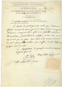 6 ventôse an II (24 février 1794), 1 page in-4 : " citoyen représentant, (…) si j'ai eu la lacheté de commettre quelques délis, je vous demande de me faire traduire au tribunal révolutionnaire, pour y être jugé et puni, mais si je n'ai cessé de rendre des services signalés à la République depuis le commencement de la guerre, il n'est pas juste je reste plus longtemps dans les fers. Tu es trop juste et ton ame est trop élevée pour laisser gémir plus longtemps dans les fers un brave sans-culotte qui peut rendre des services à sa patrie… " [Promu général de brigade provisoire dans l'armée de Moselle le 5 septembre 1793, il est blessé lors de la bataille de Pirmasens le 14 septembre 1793, au cours de laquelle les Français perdent le combat face aux troupes prussiennes et de Brunswick. Il est envoyé à Paris le 26 septembre suivant pour faire son rapport sur cette défaite. Il est arrêté le 6 octobre 1793 et destitué.] - P.S. par les membres du comité de sûreté générale, 14 messidor an II (2 juillet 1794), 1 page in-fol., en-tête " Convention Nationale, Comité de Sureté Générale et de Surveillance de la Convention nationale ", cachet cire sous papier. Ordre d'arrestation et d'amener à la prison de la Force, signé par les conventionnels Jacques-Philippe RÜHL, Moïse BAYLE, Elie LACOSTE et LOUIS du BAS-RHIN. Signature au dos de " BAULT " concierge de la prison de la Force. - P.S. par le greffier aux interrogatoires du " Premier Conseil de guerre permanent ", 8 floréal an VII (27 avril 1799), adressée " au concierge de la maison d'arrêt de la Force ", cachet encre noir au verso " N°I GRANDE FORCE ". La prison de La Force est un hôtel particulier qui fut transformé en maison de détention pour la ville de Paris entre 1780 et 1845. La prison fut divisée en deux, la Grande Force pour les hommes et la Petite Force pour les femmes.