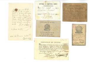 L.A.S. de Bon Charles CAHIER de GERVILLE (1751-1796), ministre des affaires étrangères en 1791-1792, 21 janvier 1792 : " Je fus chargé par le roi messieurs de vous faire savoir que Sa Majesté désire que vous vous rendiez près d'elle à midi & demi. Je me rendrai de mon côté au château… " - Carte de fédéré de 1792, impr., 11,5 x 8 cm - Billet d'entrée à l'Hôtel-Dieu, 6 août 793 - L.S. de la commune nommée " Bedouin l'Infâme " (Vaucluse), 1794 - L.A.S. décrite de Marseille, 1794, en exergue : " Comune sans nom, cydevant Marseille " - Certificat de civisme délivré par la société du club national de Bordeaux, 17 floréal an II (4 mai 1794) avec attestation de civisme - P.S. de l'hôpital général de la Salpêtrière, 1795 - L.A.S. signée par Claude Alexandre YSABEAU, député conventionnel et par les membres du comité de sûreté générale, 24 prairial an III (12 juin 1795), donnant des directives dans la préparation du jugement des députés Montagnards arrêtés lors de l'insurrection de prairial. - Carte d'électeur de l'an V (mars-avril 1797) - Carte civique délivrée par le canton de Bruxelles, 18 pluviôse an VI (6 février 1798) - P.A.S. de Jean Michel MOREAU le jeune (1741-1814), illustrateur et graveur, Paris 1er thermidor an VI (19 juillet 1798), quittance de paiement délivrée à l'éditeur Renouard " pour le payement des quarante huit dessins que j'ai fait pour édition de Gessner… " - Nominations d'institutrices (2 pcs) - 12 L.S. ou P.S. à vignettes, en majorité signées par des députés de la Convention nationale - P.S. par le " chevalier de la Pelouze ", colonel d'infanterie chargé du détail des grâces militaires dans l'armée des émigrés, Londres, 19 août 1799, 1 page in-fol. - etc.