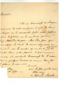 1 page in-8 (manque bas gauche). " Monsieur, j'ai eu beaucoup de chagrin de manquer de votre compagnie et aussi de Dumergue sur le dimanche passé, mais j'espère d'avoir le plaisir sur le vendredi prochain chez monsieur Dumergue. Mon père prie que vous aurez la bonté de venir chez nous (…) et de porter dans votre pouche [sic] le petit oiseau comme il souhaite beaucoup de le montrer à quelques dames et amis… " John Roger Arnold est le fils du célèbre horloger anglais, John Arnold (1736-1799), celui qui en 1778 crée une révolution dans le chronométrage de précision avec le Arnold n° 36. Le monde de l'horlogerie applaudit pour sa précision. Suite à ce succès, Arnold appelle le chronométreur un " chronomètre ", terme encore utilisé à ce jour pour désigner une pièce d'horlogerie extrêmement précise. Arnold était un grand ami d'Abraham-Louis Breguet, lesquels se confièrent mutuellement leurs fils respectifs en apprentissage dès 1792, l'un à Paris et l'autre à Londres. Les deux horlogers eurent l'un sur l'autre une influence considérable, Arnold inspirant à Breguet l'invention du tourbillon. Quatre ans plus tard, John Roger Arnold rejoint l'entreprise de son père, qui devient Arnold & Son. La manufacture d'horlogerie devient rapidement le principal fournisseur de montres de la Royal Navy.