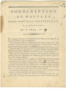 [Premier Empire] fascicule promotionnel. Rare fascicule publicitaire, intitulé " Souscription de montres d'une nouvelle construction par Breguet, quai de l'Horloge, n°51 ", non daté [avant 1794],