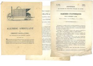 in-16, 31 pp. - " Notice explicative de M. Lenoir, fils sur les produits nouveaux de son établissement présentés à l'Exposition de 1823 ", 14 pp. broch. - " Rapport sur un alambic d'une nouvelle construction (…) par le C. Bonnemain, membre du lycée des Arts… ", 4 pp. in-4 - - " Alambic ambulant ou charriot distillatoire, de l'invention du sieur Magnan, breveté. ", 3 pp. in-4 - " Nouveau moyen de fabriquer des chapeaux velus, avec les poils de lièvre (…) par Guichardière… ", 2 pp. in-4 - " Barèmes cylindriques de M. Lorimier, l'aîné… ", 2 pp. in-4 - " Exposition de 1823 - Notice sur les instruments présentés à l'exposition par M. Cauchoix, opticien ", 4 pp. in-4 - " Description et usage du cadenas de sureté, à combinaisons… ", 2 pp. in-4 et planche - Brochure de la maison Cabany avec L.A.S. de Cabany l'aîné datée de Paris du 16 septembre 1819, 2 pages in-4 - etc.