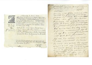 P.S. par les officiers de la corvette anglaise Le Bull Dog, faits prisonniers à Ancône, 21 germinal an IX (11 avril 1801), serment de prisonniers sur parole + billet d'un sous-officier français : " Reçu du commandant de la marine d'Ancône cinquante prisonniers de guerre provenant la corvette le Bull Dog ". - L.A.S. de Louis Thomas VILLARET-JOYEUSE (1750-1812), amiral, en rade de Brest à bord du vaisseau amiral l'Océan, 3 frimaire an X (24 nov. 1801), vignette, ordre à un aspirant de 2nde classe " de s'embarquer sur le vaisseau où j'ai mon pavillon. " - P.S. des officiers municipaux de Nice délivrant un certificat à l'équipage de la tartane appelée la Caroline, 24 déc. 1801 - L.A.S. d'un marchand mercier et parfumeur, Rouen, 13 frimaire an XI (3 déc. 1802), adressée à un négociant au port du Havre : " Comme vous faite réarmé votre navire La Gérémie pour le Cap je pran la liberté de vous réitéré mes offre de services dans toute les articles de mon magasin & donc j'ay l'avantage de fournir à la plus grande partie des armateurs de chez vous… ". - L.A.S. d'un marin hollandais naufragé, membre d'équipage du navire américain " Le Président ", Boulogne, 8 décembre 1803, adressée à son père, 1 page ½ in-4 : " Mon cher père grâce à dieu je suis bien portant à Boulogne. Le navire ayant été échoué sur les côtes. Nous n'avions point de canons pour faire un signal de détresse. L'agitation de la mer ne permettait pas de faire usage de la chaloupe & nous étions à deux cent âmes tous dans le désespoir. Il faisait noir. Je me déterminais à sauter dans la mer pour parler une patrouille qui se trouvait à la côte. J'ai réussi à gagner la terre… " - L.A.S. de Pierre Charles de VILLENEUVE (1763-1806), vice-amiral, " à bord du Majestueux en raide de l'Ile d'Aix ", 6 messidor an XII (25 juin 1804), 1 page ¼ in-4, remerciant son neveu de la part qu'il a pris à son avancement en tant que vice-amiral. - L.S. des membres composant le conseil de santé de l'école de médecine navale de Rochefort, Rochefort, 8 vendémiaire an XIV (30 sept. 1805), vignette et cachet encre. - L.S. de Antoine Louis GOURDON (1765-1833), vice-amiral, Rochefort, 30 vendémiaire an XIV (22 oct. 1805), vignette et cachets encre. - L.A.S. d'une femme adressée à son époux capitaine prisonnier en Angleterre à bord du ponton le Sandwich à Chatham - L.A.S. et L.S. de François Etienne comte de ROSILY MIRBOS (1748-1832), vice-amiral et directeur du dépôt général de la Marine, 1806 et 1809 - P.S. signée par un contremaître forestier de la marine, 15 mars 1806, visite de bois pour la construction de vaisseaux de guerre - L.A.S. adressée à un prisonnier de la frégate " La Libre " enfermé à Norman Cross en Angleterre, 1806 - L.A.S. de Guy Victor DUPERRÉ (1775-1830), capitaine de frégate (amiral et ministre de la Marine sous Louis Philippe), Rivière de Pontrieux, 17 déc. 1806, 1 page in-8 + portrait lithographié - Quittance signée par le consul de France à Rome, 4 août 1808, au sujet de dépenses de la marine. - L.A.S. de Frédéric BARBIER, soldat à la 1ère compagnie du 4e bataillon du 8e régiment d'infanterie de ligne, Brest, 16 août 1810, avec superbe vignette de navire, adressée à son grand-père dans le Haut Rhin : " (…) nous sommes arrivé à Brest en Bretagne, sant que la marche mai fait aucune penne, sur dergnier port de maire de France et le plus baux, et que j'ai vut des jolly bâtiment et vessaux telle que vous le voye sur la lettre, et aussi pour vous faire savoir que nous ne resterons plus long temps ici nous avons l'hordre pour partir le 27 du courant pour aller rejoindre notre régiment qui est en Espagne… "