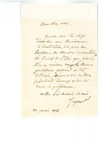 1 page in-8. Il le prie " d'accueillir avec bienveillance la candidature, à la place de professeur de chant au Conservatoire, M. Guillot de St Bris que je connais sous les meilleurs rapports comme professeur profond et distingué ; pour le bien des élèves je souhaite beaucoup qu'on lui donne la préférence… ".