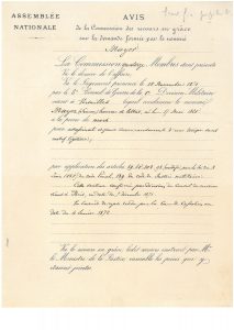 « D’après les renseignements qui m’ont été fournis, je crois, en vérité que ces deux jeunes gens ont été très injustement arrêtés et j’ose demander que leur cause soit examinée avec une sérieuse et bienveillante attention. ». – L.A.S. de François JOURDE (1843-1893), comptable et communard, Versailles [Prison de Saint Pierre], 27 juillet 1871, adressée à sa mère, 1 page ½ in-8 avec enveloppe oblitérée : « (…) J’ai pour supporter ma détention, le sentiment intime de m’être conduit en honnête homme, dans les délicates et pénibles fonctions, qu’un dévouement profond pour tus les intérêts m’a fait accepter dans des circonstances difficiles et douloureuses. C’est donc dans la conscience de l’abnégation et du désintéressement que je n’ai cessé d’apporter dans l’accomplissement de ma lourde tâche, que je puise la patience et le courage si nécessaire dans ma captivité… » [Lors des élections du 26 mars il est élu au Conseil de la Commune pour le Ve arrondissement. Nommé Délégué aux finances, sa pondération de bon gestionnaire et son respect scrupuleux de la Banque de France lui attirent la rancune de nombreux communards, mais il arrive à payer la solde des Gardes nationaux, faisant ainsi vivre près de 500 000 parisiens. Les tribunaux versaillais lui en montreront peu de gratitude, puisqu'il est arrêté le 30 mai, condamné, en septembre 1871, à la déportation simple en Nouvelle-Calédonie à l'île des Pins. Il est transporté à bord de la «Guerrière» qui atteint l'île des Pins en novembre 1872. Bien vite ses compétences de gestionnaire sont utilisées dans la colonie, il est autorisé à rejoindre Nouméa en octobre 1873 où il trouve un emploi de comptable. Il fonde avec Juliette Lopez (compagne du docteur Rastoul) l'Union, une société de secours mutuel et d'assistance aux déportés dans le besoin. Il s'évade en mars 1874 avec d’autres camarades. Installé en Angleterre, il participe à une souscription destinée aux victimes de la répression versaillaise. Il s'installe à Strasbourg (alors en Allemagne), puis à Genève, Bruxelles et Londres de nouveau. Revenu en France après l'amnistie de 1880, il se montre particulièrement actif dans la solidarité avec les Communards amnistiés.] – L.A.S. de Pierre Ulysse PARENT (1828-1880), dessinateur en objets d’art et communard, Versailles [prison de Saint Pierre], 27 juillet 1871, adressée à son épouse, 2 pages in-8, sur le ton de l’ironie : « (…) Je n’ai pas reçu encore aujourd’hui jeudi d’assignation, cela me fait craindre que les débats ne commenceront pas lundi, puisque suivant la loi il faut trois jours francs entre la remise de l’assignation et l’ouverture du procès. C’est pour moi une prolongation de détention et je n’en suis pas fort aise. J’ai vu le médecin de la prison qui pour ma diarrhée, qui du reste me fait moins souffrir m’a recommandé de prendre des potages et de m’abstenir de fruits crus. (…) Je n’ai pu obtenir le vain que je sollicitais et qui serait contraire à mon indisposition ; aussi ne pouvant noyer l’ennemi, je me dépouille comme je peux ; le gros de l’armée a du reste battu en retraite. Je n’ai plus à faire qu’à quelques francs-tireurs isolés que je vais pincer derrière leurs dernières embuscades ; mais j’ai eu à dompter à mon tour une formidable insurrection. Je suis en train de préparer une note pour mon avocat ; cela m’occupe et me fait presque rire, car je cherche vainement à pallier ou à expliquer quelques faits qui me seraient contraires, je ne trouve que du bien à dire de moi. Cela m’effraye un peu car j’ai vu à Satory plus de 500 détenus qui tous sont encore plus innocents que moi… ». [Fils d'horloger, il est dessinateur en objets d'art et milite au sein de l'opposition républicaine au Second Empire. Pendant le siège de Paris par les Allemands (septembre 1870-mars 1871) il est nommé maire adjoint du 9e arrondissement. Le 26 mars, il est élu au Conseil de la Commune par le 9e arrondissement, mais il en démissionne le 5 avril. Il continue à militer dans la franc-maçonnerie en faveur de la Commune. Arrêté pendant la Semaine sanglante le 27 mai, il est accusé d'avoir incendié le quartier de la Bourse, mais cas rare il est jugé et acquitté en septembre 1871. À sa mort, il était conseiller municipal de la ville de Paris. Il publie dans le Journal du peuple le récit de son incarcération qu’il intitule « Une arrestation en mai 1871 »] – L.A.S. d’Antoine de CASTELLANE (1844-1917), député du Cantal, Paris, 28 août 1871, adressé à un général. Intervention en faveur de Joseph Held détenu à Satory. – L.A.S. d’Edouard Thomas CHARTON (1807-1890), journaliste et député, [Paris] Assemblée nationale, 11 septembre 1871, adressée au général Félix Antoine Appert, chargé de diriger la justice militaire qui juge les Communards à Versailles : « Ne serait-il pas possible d’obtenir la libération d’Elysée Reclus, détenu au fort Kélern près Brest. Sa captivité, déjà bien longue, a altéré sa santé. La société de géographie, dont il est un des membres les plus savants, l’a recommandé. Sa femme est partie une seconde fois pour aller chercher à le voir : elle n’a aucune autorisation… » [Elisée RECLUS (1830-1905), conquis à l’idée républicaine, quitte la France après le coup d’État du 2 décembre 1851. Aux États- Unis, il tentera de fonder, sans succès, un phalanstère agricole. Dès les années 1860, il commence à publier des travaux qui font tôt référence en géographie dans le monde. Il participe aussi à la fondation de plusieurs coopératives à son retour en France. Il adhère en 1865 à l’Alliance internationale de la démocratie socialiste de Bakounine. Il participe activement à la Commune. Il a décrit dans ses souvenirs la haine et la violence des Versaillais à l’égard des pris