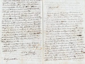 Kirchberg, 3 août 1841 [Le comte de Locmaria raconte en détail l'accident de cheval survenu au comte de Chambord le 28 juillet 1841 qui le forcera à une longue convalescence, et lui laissera une claudication.] : " Mon cher général, vous avez déjà appris par les journaux l'accident arrivé à monseigneur le duc de Bordeaux, vous serez bien aise je n'en doute pas d'avoir sur ce malheureux événements tous les détails que les journaux n'ont pu vous donner (…) Les orléanistes vont chercher à exploiter l'accident survenu au Prince, ils diront aux légitimistes : voyez à quoi tient votre parti, il tient à l'existence d'un jeune prince aussi malheureux que ses parents… " Plymouth, 31 décembre 1843 : " Mon bon général, j'arrive à Plymouth pour commencer une tournée des ports de la Grande-Bretagne qui sera le dernier acte du séjour du duc de Bordeaux en ce pays. (…) ce que ma position me permet d'apprécier plus que personne, c'est qu'il y a dans notre jeune prince assez d'étoffe pour qu'il ait grandi à mesure que le théâtre s'est élargi sous ses pas (…) je crois que le voyage de Londres fait faire au prince un grand pas vers Paris… " + un billet manuscrit au texte codifié. Frohsdorf, 1er janvier 1848 : " Mon bon et cher duc (…) j'ai trouvé la famille royale en très bon état de santé et fort occupée des malheurs qui vous ont frappé à des intervalles si rapprochés. (…) Quant j'ai rejoint monseigneur il se disposait à se mettre en route pour l'Italie, et nous partons en effet demain pour Venise. Madame la comtesse de Chambord est du voyage (…) elle est d'une prestance et actuellement dans un état de santé qui donnent tout lieu de croire qu'elle aura de robustes enfants… "