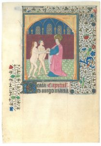 Peinture : Adam et Eve prenant conscience de leurs nudités - thème fort rare nord (Reims ?) 15éme. 18,9 x 13,6 cm.