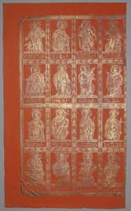 dorée (4x4) et (5x4), 20,5 x 35 cm ; 3 planches de saints à encore argentée dont 1 p. (6x4) signée en bas In Augsp Bey Ioannes Carl Munck n°135 (en l'état), et 1 p. (8x4), 43 x 35 cm ; 1 p. (4x4) 34,5 x 43 cm. Très rare. Ces papiers dorés ou argentés surnommés " Brokatpapiere " sont une spécialité allemande, fabriqués à Augsbourg dès la fin du XVIIe siècle.