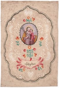 agrémenté de volutes, de découpes géométriques et de Valenciennes, et de fleurs peintes (roses, tulipes), un médaillon central à décor finement peint représentant saint Joseph, une palme dans la main droite et l'Enfant Jésus appuyé tendrement contre lui, auréolés de jaune et ressortant sur un fond mauve. Cartouche frangé de rouge et de rose portant l'inscription en lettres d'or S. Josephus. 20,5 x 12,5 cm. Piqûres, traces de pliures en bordure. - dans un écusson baroque à double tracé bleu et or sur marge blanche, à décor de fines découpes aux motifs géométriques, de picoté, de lignes et de fleurs peintes, un médaillon central de forme octogonale à décor finement peint représentant saint Laurent de Rome sur un fond mauve auréolé de jaune, vêtu d'une dalmatique à dominante rouge et rose, tenant dans sa main droite un gril et dans sa main gauche une palme et l'évangile ouvert. Cartouche cerné de rouge et de rose portant l'inscription en lettres d'or S. Apollonia. 21,5 x 15 cm. Trace de pli, piqûres et mouillures. - dans un écusson baroque à double tracé bleu et or sur marge blanche, à décor de fines découpes aux motifs géométriques, de picoté, de lignes et de fleurs peintes, un médaillon central de forme octogonale à décor finement peint représentant sainte Apolline sur un fond azur auréolée de jaune, vêtue d'une chape rouge, d'un corsage bleu sur une robe jaune, elle tient dans sa main droite la palme du martyr et dans sa main gauche une tenaille évoquant sa passion. Cartouche cerné de rouge et de rose portant l'inscription en lettres vertes S. Laurentius. 21,5 x 15 cm. Piqûres et mouillures.