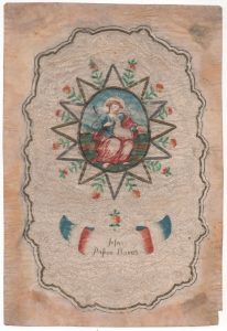 central étoilé d'or et d'argent à décor finement peint représentant Jésus le bon pasteur auréolé, vêtu d'une tunique bleue et d'un manteau rouge et rose, couvert d'un chapeau de paille jaune, portant dans sa main droite le bâton de berger et assis sur ses genoux un agneau. Cartouche tricolore portant l'inscription en lettres d'or Jesus Pastor Bonus. 27 x 18,5 cm. Un peu défraîchi, petit accident en haut au centre.