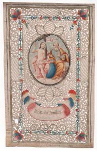 réseau de Valenciennes, de capillaires, de volutes, de guirlandes bucoliques et de fleurs aux quatre angles. Sur un fond azur sont représentés Jésus le Fils auréolé portant la croix, à sa gauche, Dieu le Père tenant le sceptre et paré d'un triangle comme auréole, et entre les deux, l'Esprit Saint représentant sous la forme d'une colombe. Cartouche tricolore portant pour inscription en lettres d'or : Sanctu Trinitas. 26 x 16,5 cm. Petits manques et bordures défraîchies.
