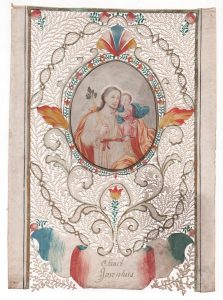 de découpes rayonnantes, capillaires, volutes, fleurs et guirlande florale peintes, un médaillon central peint représente la lactation de saint Bernard de Clairvaux. Cartouche tricolore portant l'inscription à lettres d'or : S. Bernardus. 28,5 x 17 cm. Petits accidents et manques. - Un médaillon central peint cerné d'or et de guirlande florale représente saint Joseph, tenant dans sa main droite une tige de lys et dans sa main gauche l'Enfant Jésus, aux entours à décor de découpes de capillaires, volutes, végétaux et fleurs peintes. Cartouche tricolore portant l'inscription en lettres d'or : Sanct. Josephus. 24,5 x 18 cm. Accidents et manques (partie inférieure). - Sur une lourde croix peinte en brun, maintenue en terre par deux pieux, Jésus, le front ceint de la couronne d'épines, le corps enveloppé dans une draperie rose, nouée sur le côté, porte les marques de son supplice. Ses plaies saignent aux mains, aux pieds et au côté d'où le sang jaillit recueilli par une coupe dorée. Au sommet de la croix, les lettres I.N.R.I. Le sujet s'étale sur un riche décor de fines découpes de capillaires, volutes, Valenciennes, fleurs peintes. Cartouche cerné de rose portant l'inscription en lettres d'or : Consumatum est. 28,5 x 19,5 cm. Mouillures en bordure.