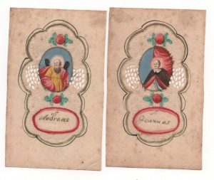 [Imagerie religieuse] Canivet. XVIIIe siècle. Réunion de 9 canivets sur papier, formats divers, 11,5 x 6,5 cm et 13 x 8 cm. Dans un tracé baroque noir et or, à décor de découpes de Valenciennes, de picotés et de roses peintes, médaillon...