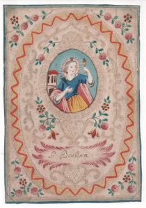 [Imagerie religieuse] Canivet. 11 canivets. XVIIIe et XIXe siècles. Canivet sur papier représentant dans un médaillon peint sainte Barbe vêtue d'un juste au corps bleu et d'une robe jaune drapée dans un manteau rouge, tenant dans sa main droite...