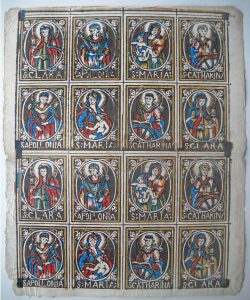 cm ; planche à compartiments de saints (6x6), 1ère moitié du XIXe siècle, 38 x 30,5 cm.