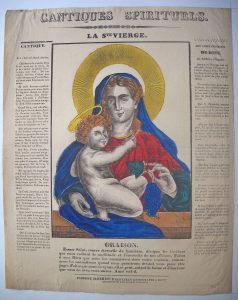 [Imagerie religieuse] METZ. Adrien-Népomucène DEMBOUR (1799-1887), actif seul de 1835 à 1840. 2 épreuves, gravure sur bois coloriée au pochoir, montées sur papier fort : Cantiques spirituels, La Ste Vierge, 41 x 32,5 cm ; planche à...