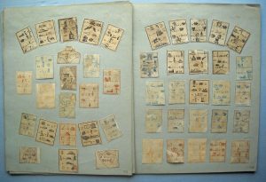 rébus, demande et réponse, bons points scolaires et religieux, etc. - Album à l'italienne " Les cent et un rébus charivariques ", 1847 (incomplet). Au XIXe siècle, les vignettes à rébus, réponse et demande ou à historiettes, ornaient l'intérieur des boîtes de confiserie, l'enveloppe même des bonbons, les étiquettes de liqueurs et de parfums. Ce sont les marchands d'estampes parisiens qui les éditèrent le plus souvent.