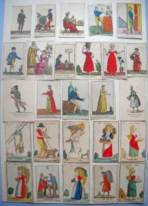 représentant des corps de métiers (dont les cris de Paris), la vie du soldat français, grotesques et militaires, théâtres et spectacles forains, contes enfantins, les types sociaux, la bonne éducation, l'enfant mal élevé, les jeux innocents, les âges de la vie, les saisons, sujets légers et grivois. Joint : planche d'images à découper intitulée Marchands de Hambourg et éditée par la fabrique de Pellerin à Epinal. A la fin du XVIIIe siècle et surtout au XIXe siècle se multiplie à Paris chez les éditeurs de la rue Saint Jacques cette production d'images divisées en 4, 8, 16 rectangles et plus.