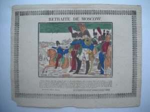[Imagerie populaire] ÉPINAL. Fabrique de PELLERIN, de l'Empire à la Royauté (1810-1830). 5 épreuves, gravure sur bois coloriée au pochoir, montées sur papier épais : Retraite de Moscow, gravée par Réveillé, 31,5 x 41,5 cm [ca 1812-1815] ;...