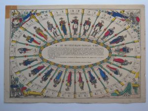 jeu de l'oie ", n°1701, 29,5 x 39 cm ; " Règle du jeu de l'oie ", 26 x 24,5 cm ; " Jeu de l'oie ", n°79, 30 x 39,5 cm ; " Jeu de l'oie ", n°1711, 35,5 x 41,5 cm, collée sur carton, pet. déf. ; " Jeu du conscrit ", n°1737, 40,5 x 59 cm, " Jeu des courses de chevaux ", n°1742, 44 x 58,5 cm, manques et restaurations ; " Nouveau jeu des singes ", n°1706, 40 x 29,5 cm ; " Jeu militaire ", n°1702, 29,5 x 39 cm ; " Loterie des troupes françaises anciennes et modernistes ", n°701, 40 x 30,5 cm ; " Jeu du siège de Sébastopol ", [1855], 47 x 36,5 cm, pet. déf. Joint : Pinot & Sagaire, 2 épreuves : " Règle du jeu de l'oie ", 28 x 41 cm ; " Jeu de l'état major français ", n°385, 28 x 40 cm. Montées sur papier épais.