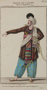Théatre. Recueil de 75 planches gravées représentant des acteurs dans leurs de costumes de théâtre, par Maleuvre, 70 coloriées. Paris, Hautecoeur Martinet. Les planches sont montées sur support, dans un carton à dessin.