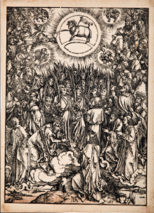 Dürer (Albrecht). L’Apocalypse de saint Jean : Les Quatre Anges de l’Euphrate. Gravure sur bois monogrammée, 39,4 x 28,3 cm. Rognée à l’extérieur du trait carré, (Meder 171).Tirage vers 1520-1540.