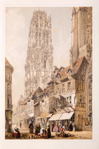 Brandling (Henry Charles). View in the north of France.(Londres 1848) in-folio demi-chagrin rouge à coins, de l’époque. 12 planches lithographiées et aquarellées, avec notices (Dieppe, Caudebec, Eu, Rouen,Amiens)^