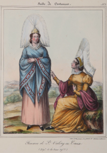 Costume. Un carton renfermant 13 lithographies en couleurs de costumes normands (Lanté et Gatine, Charpentier), 20 planches in-8 de costumes du début du XIX° siècle et un ensemble d’une trentaine de planches extraites de revues de modes fin XIX°.