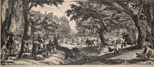 Callot (Jacques). Ensemble de 6 planches : Callot : la foire de l’Impruneta. 3ème état. (Lieure 361)- La Grande Chasse. 2ème état. (Lieure 353) La tentation de Saint-Antoine. 3ème état. (Lieure 1416). Le Petite Thèse ou le Triomphe de la...