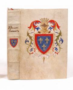 in-8, parchemin, sur les plats armes peintes en couleurs, dos à nerfs, titre calligraphié et armes peintes, [Rel. moderne].