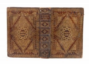 in-4, maroquin marron, sur les plats large décor de roulettes et fleurons dorés, inscription Iesus Maria dorée au centre, dos à nerfs orné de motifs dorés, tranches dorées, [Rel. de la fin du XVIe s.], frottements, restaurations anciennes.