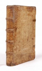 2 ouvrages en un vol. pet. in-folio, peau de truie, sur les plats multiples encadrements de motifs et figures à froid, dos à 4 double nerfs, restes de fermoirs métalliques, [Rel. de l’époque], pet. restaurations, coins émoussés.