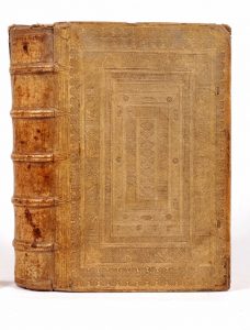 3 ouvrages en un fort vol. pet. in-folio, peau de truie, sur les plats multiples encadrements de motifs et figures à froid, au centre, fers Alde azurés à froid, dos à double nerfs, traces de fermoirs, [Rel. datée 1577], coiffe supérieur arasée, départs de fentes aux mors, un coin abîmé.
