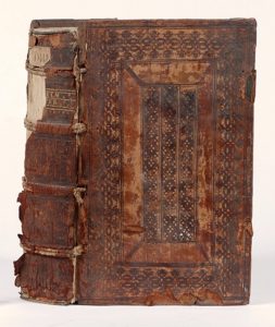 3 tomes en un fort vol. pet. in-folio, veau brun sur ais estampé de motifs à froid en encadrements concentriques et au centre des plats, dos à nerfs, traces de fermoirs métalliques, [Rel. de l'époque], accrocs au dos, frottements.