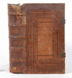 2 parties en un vol. in-folio, veau brun sur ais, large encadrement de filets et roulettes ornées à froid, dos à nerfs doubles orné de fers à l’oiseau doré, fermoirs et cornières métalliques, [Rel. de l'époque], un peu frottée, manque un fermoir, coiffe sup. et une partie du caisson de tête absentes.