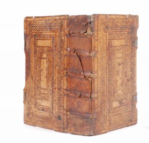 fort vol. in-4, veau caramel estampé de roulettes à froid sur les plats, sur ais à chants biseautés, dos à nerfs doubles, titre manuscrit dans le caisson de tête, fermoirs métalliques (légèrement postérieurs ?), cornières métalliques postérieures, [Rel. de l'époque], coins frottés, accrocs au dos avec petits manques.
