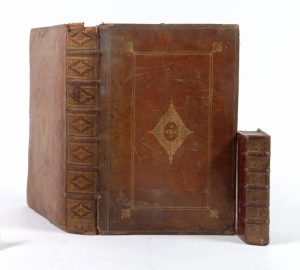 pet. in-folio, maroquin tabac, sur les plats décor d’encadrements « à la Duseuil » avec fleurons dorés aux angles et médaillon central oval, dans une dentelle en losange aux petits fers, avec les initiales DAC encadrées de fermesses, dos à nerfs orné de motifs dorés, tranches dorées, [Rel. de l'époque], accroc à la coiffe sup., mors sup. partiellement fendu, frottements.