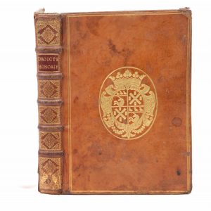 pet. in-4, veau fauve, trois filets dorés en encadrement, armes centrales dorées, dos à nerfs orné de motifs dorés, pièce d etitre rouge, [Rel. de l'époque], coiffe sup. absente, coins un peu émoussés, départ de fente à un mors.