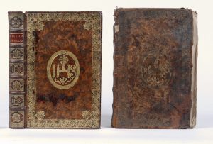 pet. in-folio, veau marbré, sur les plats large encadrement d’une « dentelle du Louvre » dorée, avec larges fleurs de lys aux angles et grand médaillon central au monogramme IHS, dos à nerfs orné de fleurs de lys, monogrammes et motifs dorés, pièce de titre acajou, tranches dorées, [Rel. de l'époque], pet. éclat aux coiffe.