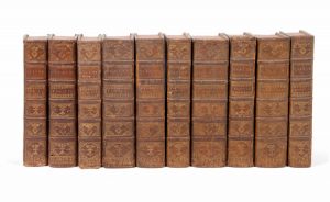 5 parties en 10 vol. pet. in-8, veau brun, dos à nerfs orné de motifs et pièces d’armes dorés, [Rel. de la fin du XVIIe s.], mors frottés, quelques accrocs aux coiffes, rares pet. manques de cuirs.
